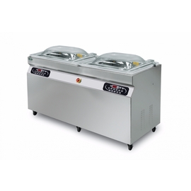 Vacuuming device, suitable for packaging any products according to individual customer requirements. Great time savings due to the possibility of carrying out several welding operations simultaneously, even with different lengths of welded seams. Design: • Double unit with 2 vacuum chambers, each with • double sealing bar and • LCD control panel for 20 programs • Stand model on castors • Stainless steel body • Weight: 260 kg Technical data: • Pumping capacity: 100-120 m3 / h • Tension: 380 V / 50-60 Hz • Vacuum: 2600 W Dimensions: • External dimensions, W x D x H: 1680 x 700 x 1050 mm • Vacuum chamber dimensions, W x D x H: 2 x (720 x 570 x 220 mm) • Sealing width: 4 x 550 mm